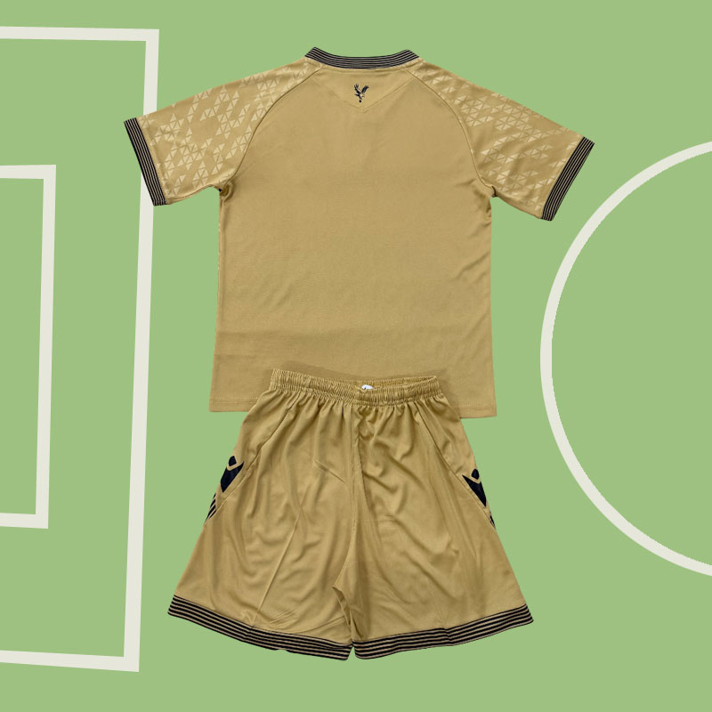 Upplev en unik stil med Crystal Palace barn fotbollsställ 2025/26 tredjeställ tröja och shorts, inspirerad av klubbens stolta arv och passion. Den eleganta Eagle Gold-designen har en krage med knappar och tunna svarta ränder längs kanten – en detalj som även återfinns på ärmsluten och de matchande strumporna med årtalet 1861 präglat på vaden. Helheten kompletteras med gyllene shorts som ger en exklusiv look både på plan och till vardags.