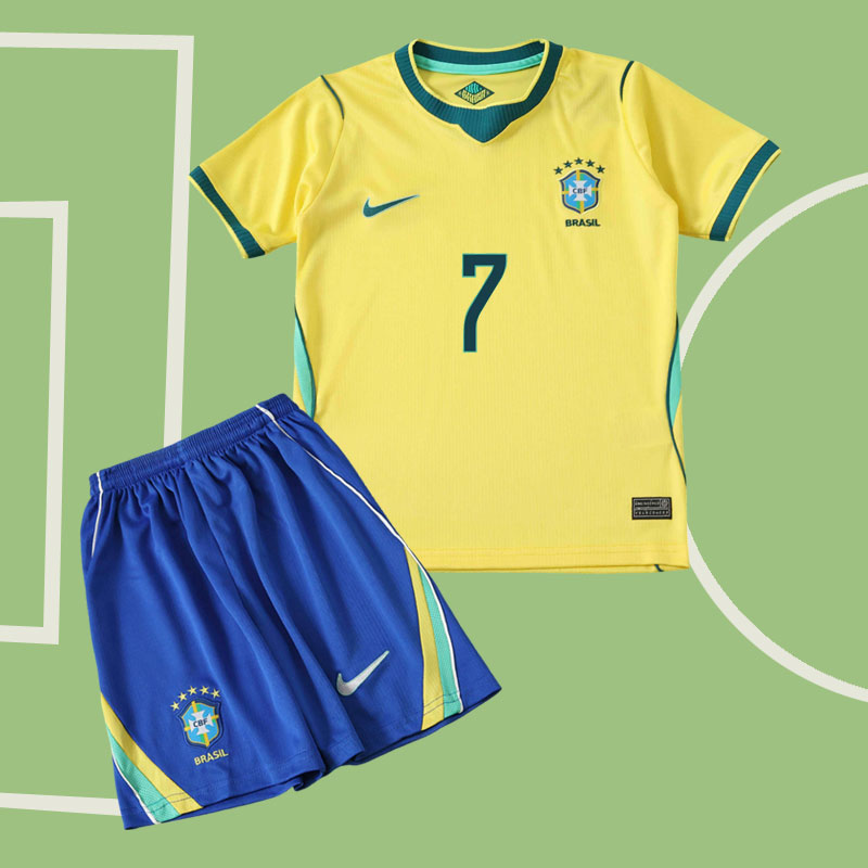 Upptäck det klassiska och stilrena barn fotbollsställ Brasilien VM 2026 – hemmatröja Vini Jr 7 med shorts, inspirerat av den ikoniska VM 1970-designen som symboliserar Brasiliens fotbollshistoria. Den välkända gula basen – ofta kallad “Yellow Canary” – kombineras med blå detaljer i två nyanser och ett modernt geometriskt mönster inspirerat av den brasilianska flaggan. Tillsammans med blå shorts blir detta ett komplett fotbollsställ barn som sticker ut både på planen och på fritiden.