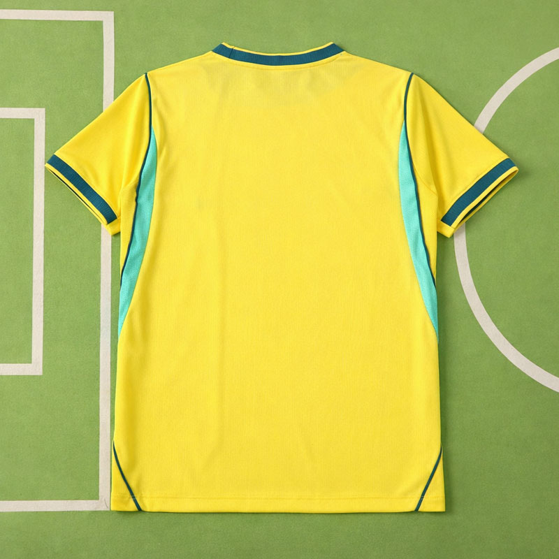 Detaljer i två olika blå nyanser skapar en fräsch kontrast till det gula – en ljus mintton kombinerad med en djupare blå färg ger ett modernt men tydligt brasilianskt helhetsintryck. Den rundade kragen med en diskret öppning framtill bidrar till en klassisk känsla med en uppdaterad touch, inspirerad av historiska VM-tröjor.