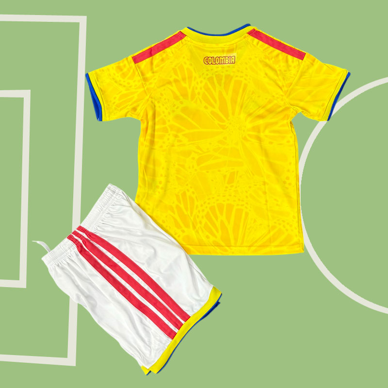 Colombia barn fotbollskläder 2026 – gul hemmatröja och vit shorts är ett perfekt val för unga fans som älskar sydamerikansk fotboll. Den klassiska gula fotbollströjan med blå och röda detaljer visar stolthet och energi, inspirerad av färgerna i den colombianska flaggan. Setet består av bekväm matchtröja och shorts som passar både träning och lek, med lätt och ventilerande material som ger maximal komfort.