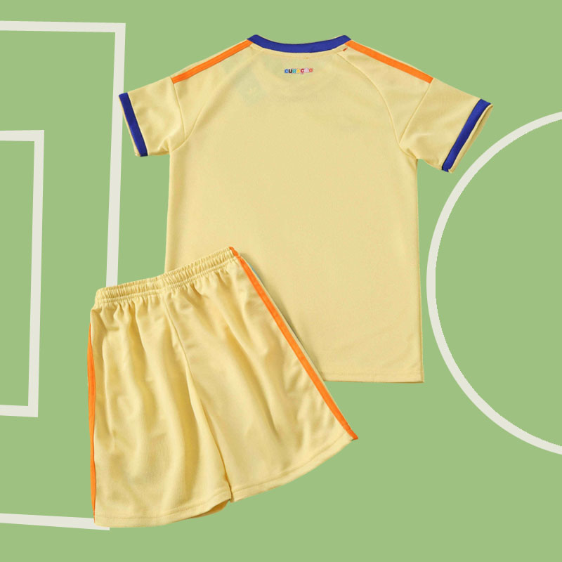 Curaçao VM 2026 bortaställ barn är ett färgstarkt och modernt fotbollsställ barn 2026, perfekt för unga spelare och fans. Den ljusgula basen kombineras med en stilren V-ringad krage i blått samt matchande detaljer på ärmarna, vilket ger ett fräscht och sportigt uttryck.