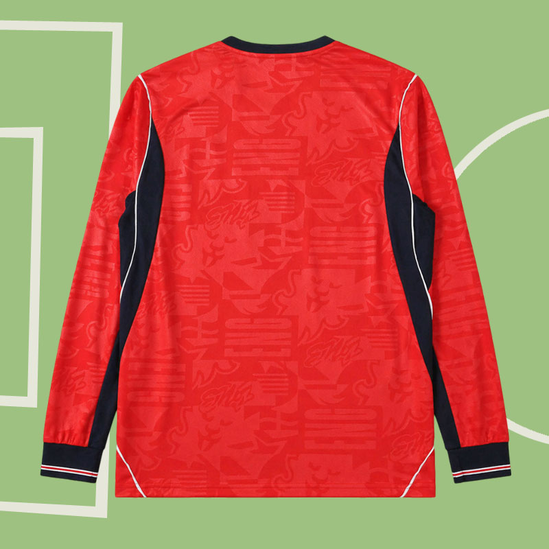 Visa ditt stöd för England i VM 2026 med denna stilrena och kraftfulla England långärmade bortatröja 2026 för herr. Tröjan kommer i en djup Speed Red nyans med mörka detaljer runt krage, ärmslut och sidopaneler, vilket ger ett modernt och sportigt uttryck som verkligen sticker ut både på planen och till vardags.