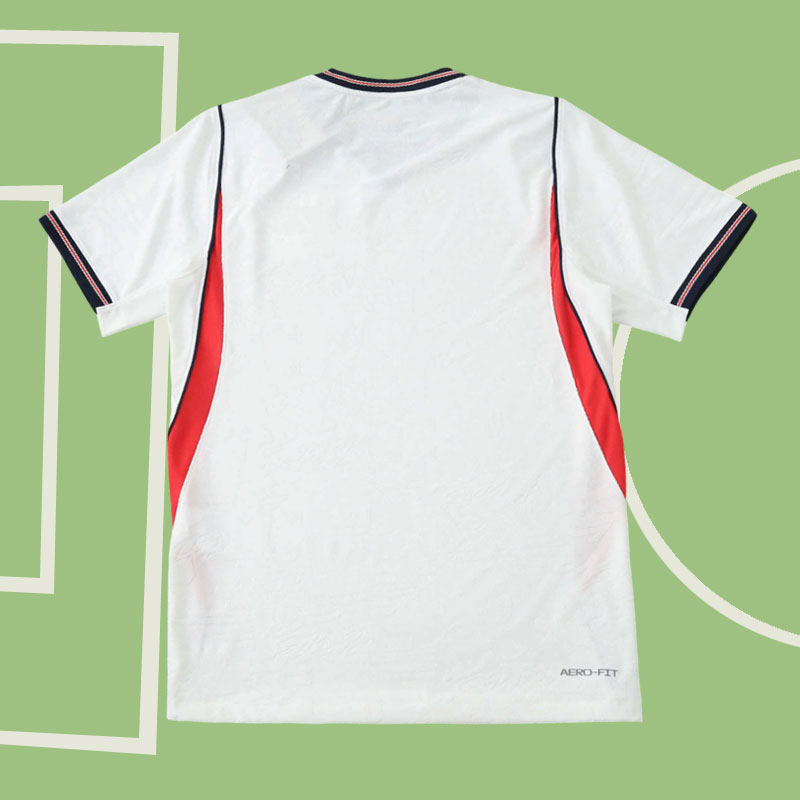 Denna England VM 2026 hemmatröja herr kombinerar klassisk design med modern teknik. Basen är stilrent vit och får liv genom ett diskret jacquardmönster som ger djup åt tyget utan att bryta den rena känslan. Marinblå detaljer längs axlarna och röda sidopaneler med navykant skapar en tydlig kontrast och ger denna fotbollströja herr kortärmad ett modernt och sportigt uttryck.