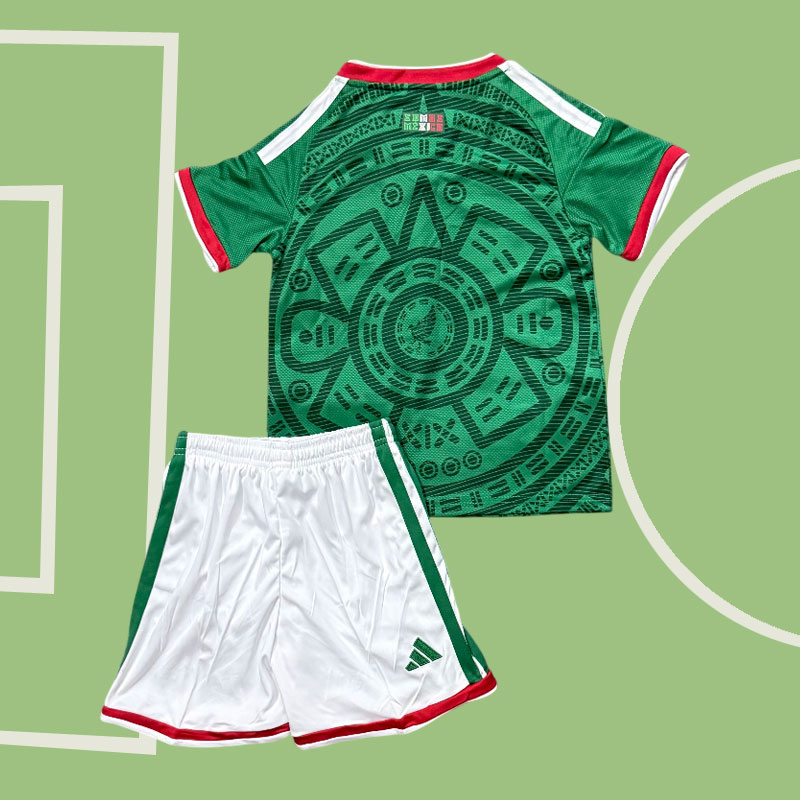 Mexiko Barn 2026 VM Hemmatröja – Fotbollströja och Shorts Set är ett perfekt val för unga fans som vill visa sitt stöd med stil. Denna Mexiko 2026 barn fotbollströja inspireras av ikoniska aztekiska mönster och kombinerar en modern look med traditionella detaljer. Grön bas med mörkare geometriska motiv skapar en kraftfull design som sticker ut både på planen och i vardagen.