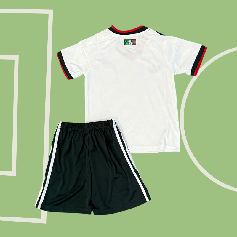 Mexiko VM 2026 bortatröja barn är en elegant och stilren fotbollströja för barn, designad i en klassisk vit färg med vinröda detaljer runt halsen och ärmsluten. Den enkla men moderna designen symboliserar Mexikos stolta fotbollstradition och ger en fräsch look för den nya generationen fans.