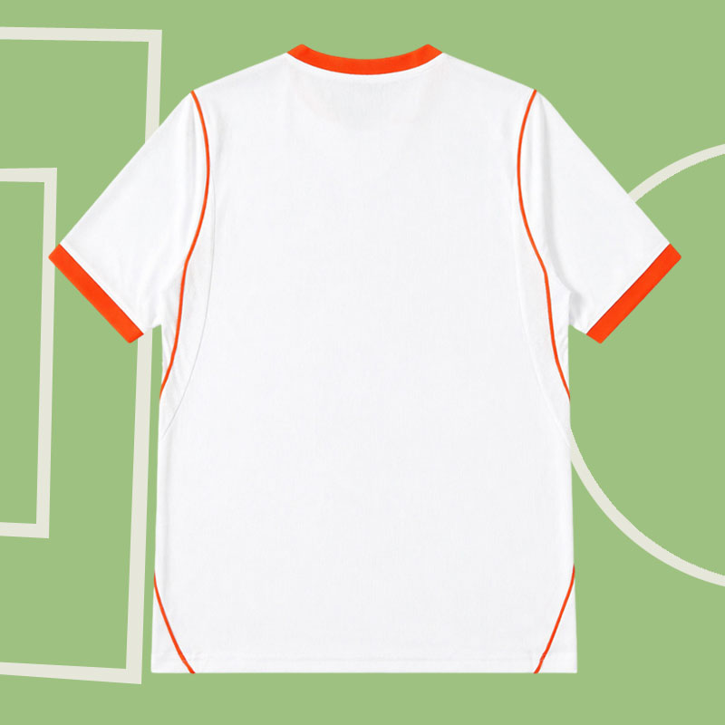 Nederländerna bortatröja 2026 VM – vit fotbollströja herr kortärmad är ett stilrent och modernt val för dig som letar efter en Nederländerna fotbollströja 2026 med unik design. Den vita basen kombineras med tydliga orange detaljer på krage, ärmslut och sidor, vilket ger tröjan en klassisk men samtidigt uppdaterad look. Över bröstet löper ett iögonfallande band med en gradient i flera nyanser av orange – en detalj som verkligen gör denna Holland bortatröja 2026 till något extra.