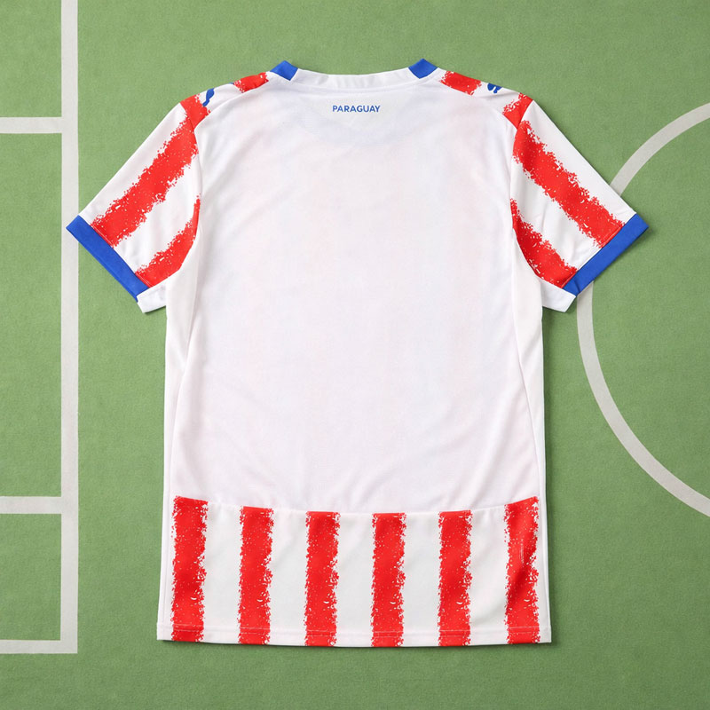 Blå detaljer på krage och ärmslut skapar en snygg kontrast och förstärker den sportiga känslan. Den kortärmade fotbollströjan är tillverkad i ett lätt och ventilerande material som ger god komfort både på planen och till vardags. Perfekt för dig som söker en Paraguay hemmatröja VM 2026 med både stil och funktion.