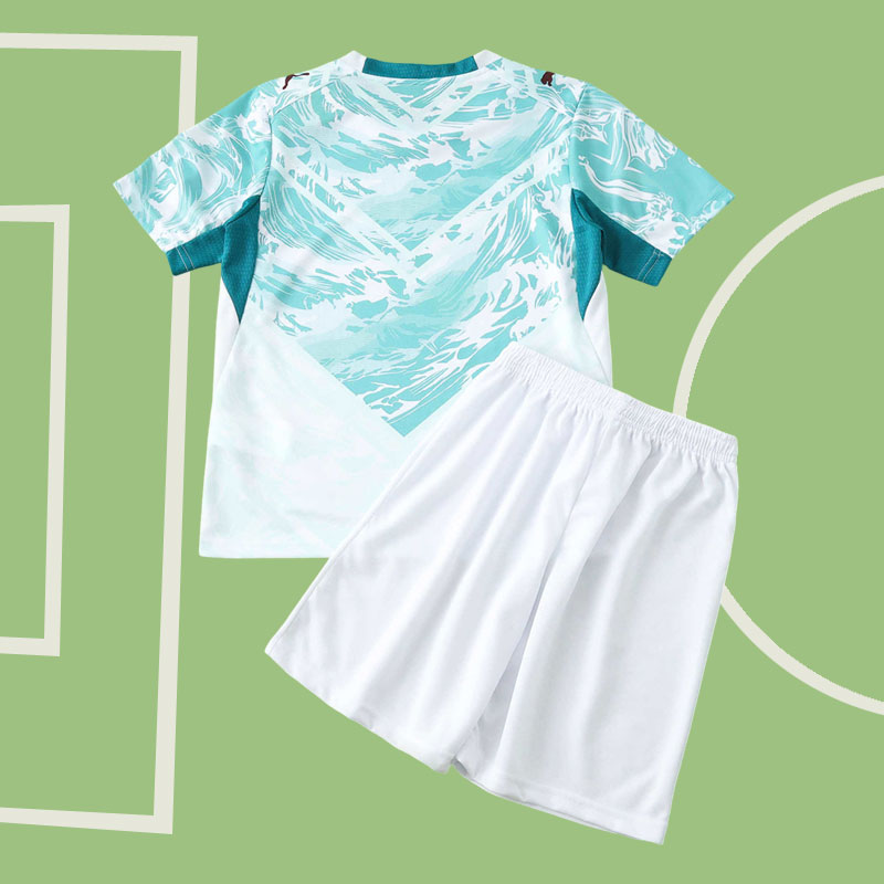 Upptäck den nya Portugal 2026 bortatröjan för barn – en perfekt kombination av stil och funktion för unga fotbollsfans. Tröjan har en vit bas med grafiska lagungröna element på bröst, axlar och övre delen av ryggen. Mönstret bildar en abstrakt, vågformad design som länkar visuellt till havstemat från hemmastället. En V-formad panelstruktur framhäver tröjans dynamik och grafiken fortsätter diagonalt över ryggen i ett mer fragmenterat mönster. Portugal-emblemet sitter centralt på bröstet och kontrasteras av mörkare gröna detaljer på krage och sidopaneler. Rund halsringning med texten “Portugal” på bakre kragen ger en stilren finish.