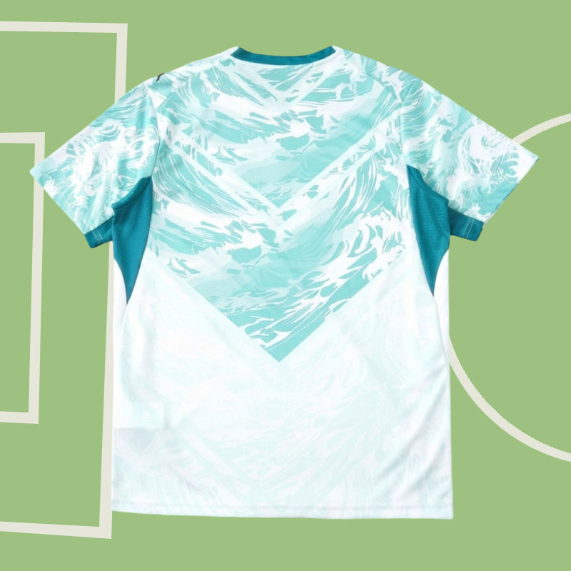 Stötta Portugal i stil med denna moderna Portugal VM 2026 bortatröja herr – fotbollströja med kort ärm. Tröjan har en vit bas med grafiska inslag i lagungrönt över bröst, axlar och övre delen av ryggen, vilket skapar en abstrakt, vågliknande design inspirerad av havet – en elegant fortsättning på hemmatröjans tema. Den V-formade panelstrukturen på framsidan och det diagonalt fortsatta mönstret på baksidan ger ett unikt och dynamiskt uttryck som sticker ut på planen.