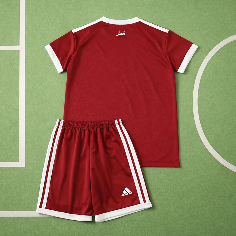 Detta Qatar 2026 hemmaställ för barn kombinerar modern design med klassiska nationella detaljer och är ett perfekt val för unga fotbollsfans. Den djupa vinröda färgen ger en stark identitet, medan vita detaljer på krage, ärmar och axlar skapar en stilren kontrast. Ett diskret grafiskt mönster löper vertikalt över tröjan och ger ett dynamiskt uttryck som verkligen sticker ut bland andra fotbollströjor barn.