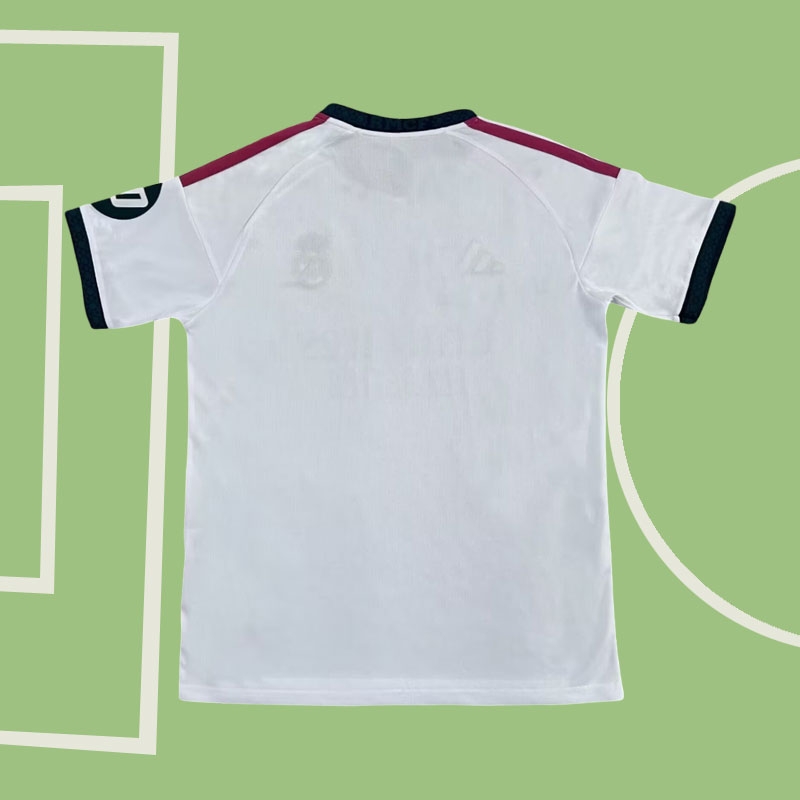 Real Madrid hemmatröja 2026/27 för herr behåller den klassiska vita looken som gjort klubben världsberömd, men med en modern twist som sticker ut. Den vita basen kombineras med mörkgröna detaljer och diskreta rosa ränder, vilket ger denna kortärmade fotbollströja ett unikt och samtida uttryck. Krage och ärmslut är elegant utformade i grönt med ett subtilt mönster, och baktill vid nacken syns ett ton-i-ton RMCF som ger tröjan extra karaktär.