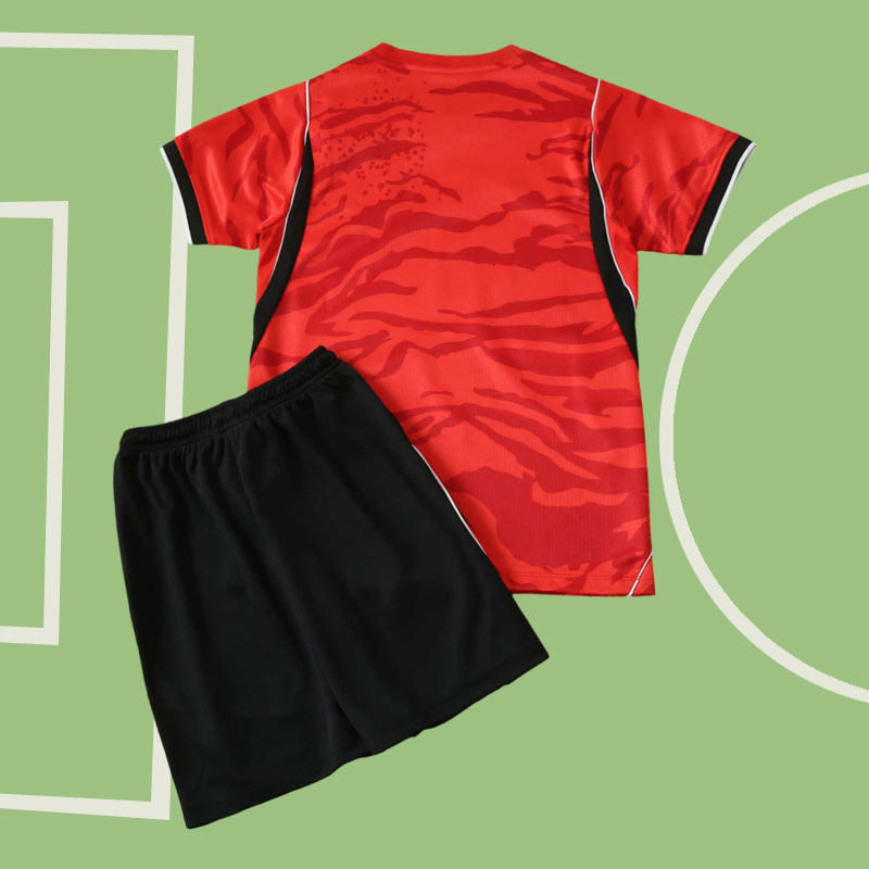 Upptäck det stilrena Sydkorea 2026 hemmatröja barn – tröja och shorts VM 2026, ett modernt fotbollsställ barn som kombinerar klassisk design med stark identitet. Den röda basen pryds av ett diskret ton-i-ton tigermönster som ger tröjan ett unikt uttryck. Vita detaljer på bröst och axlar skapar en snygg kontrast, medan svarta inslag på ärmar och sidor ger en sportig och balanserad look. Ett perfekt val för dig som söker en Sydkorea fotbollströja 2026 med både stil och karaktär.