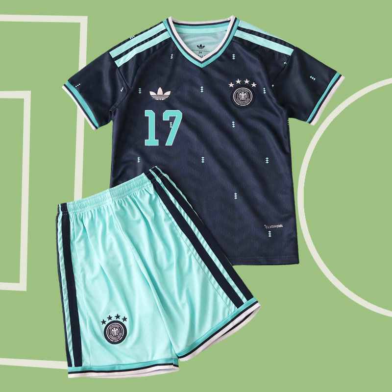 Köp Tyskland 2026 bortaställ barn – ett stilrent och modernt fotbollsset barn med tröja och shorts, perfekt för unga fans som vill bära landslagets färger. Den mörkblå basen kombineras med vita detaljer och fräscha mintgröna inslag, vilket ger ett unikt och sportigt uttryck. Det dynamiska sicksackmönstret över hela tröjan gör detta Tyskland fotbollsställ 2026 extra iögonfallande.