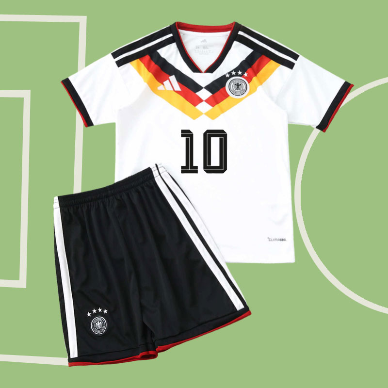 På ryggen finns trycket Musiala 10, inspirerat av Jamal Musiala – en av de mest spännande spelarna i laget. Samtidigt kan du enkelt skapa din egen fotbollströja med tryck, där du väljer namn och nummer för ett personligt Tyskland barnställ med eget tryck.