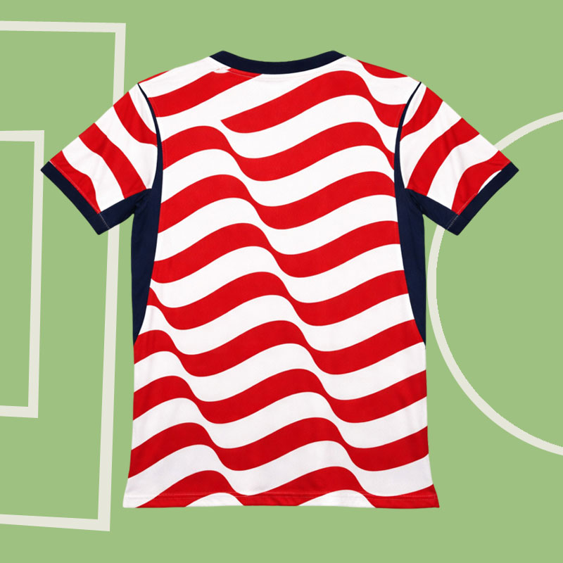 USA landslag fotbollströja 2026 – hemmatröja för VM är en modern tolkning av USA:s klassiska matchställ. Den vågformade randdesignen löper över hela tröjan och ger ett dynamiskt uttryck som skiljer sig från traditionella raka linjer. Resultatet är en iögonfallande fotbollströja VM 2026 som kombinerar rörelse, stil och identitet.